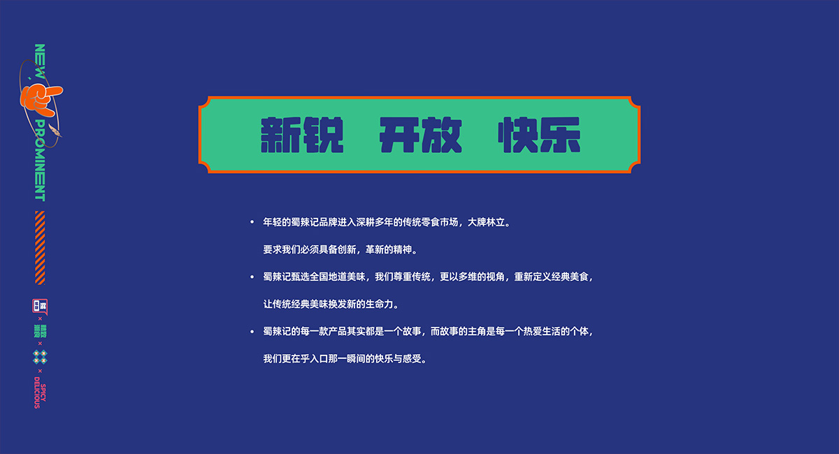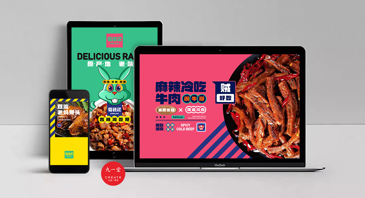 四川獨有地理環(huán)境,孕育出了許多以辣為主的酸辣雞爪、老麻兔頭、藤椒鴨等極具地方特色的傳統(tǒng)四川小吃。蜀辣記秉著熱愛川蜀辣味的初衷,重新發(fā)現(xiàn)四川味道讓極具地方特色的地方小吃煥發(fā)新的生機(jī),讓大城市快節(jié)奏下生活和工作的年輕人閑下來時,能夠享受食物帶來的美好休閑時光。此次九一堂受邀參與蜀辣記項目制作,我們旨在打造一個新銳、開放、快樂的地方小吃品牌形象而努力。