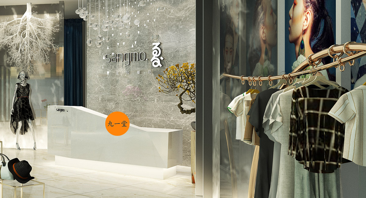 桑莫.夏是四川省本土女裝品牌,在樂山市已有多家分店,服裝多為韓式款式為主,自由隨意,個性、百搭,老店裝飾設計風格多以田園風結合當下的后現代風為主。缺乏時尚的氣息,雖然經營多年后但是品牌起色不是很大,迫切希望品牌再次包裝和亮相,此次新項目地址選在峨眉山最新的商業地產項目,憑借西南最大沃爾瑪的名氣的商場再次亮相展現自己的品牌。我們九韻一雅堂承接到甲方商業空間設計的委托后,從品牌定位,產品調性,消費群體定位, 品牌形象,VI設計,店面升級等服務板塊提高品牌形象,品牌的升級與重塑,商業空間設計的中心服務優勢,怎樣讓桑莫.夏品牌更時尚、更年輕化是我們商業空間設計考慮的要點,我們在標志上注入英文構思,放進空間,中心以“夏”字結合書法統籌文化來創造,書法結合英文的標志調配改造,再空間既有中國傳統文化又兼具時尚。空間把原來的原生態樹換造型后刷白倒掛,和黑色藝術玻璃形成鮮明的材質對比,讓傳統磕碰時尚,保留了客戶原來店想要的天然,再生態再創造。
