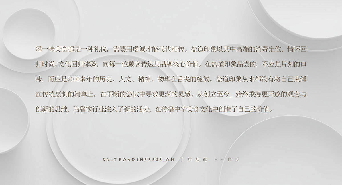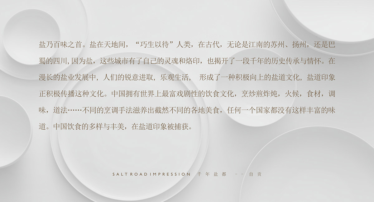 九韻一雅堂認為在鹽道印象中品嘗的,不應是片刻的口味,而是“有鹽有味”的生活,對美好生活的熱愛與對未來孜孜不倦的追求,體現在了每一道味重味厚、鮮香麻辣的美食中。現實令人們更加熱愛生活,并賦予了鹽道印象敢于冒險的精神,不斷的嘗試新的美食清單,讓生活更加富有樂趣,即使是平凡的生活,也要活出精彩、吃出精彩。