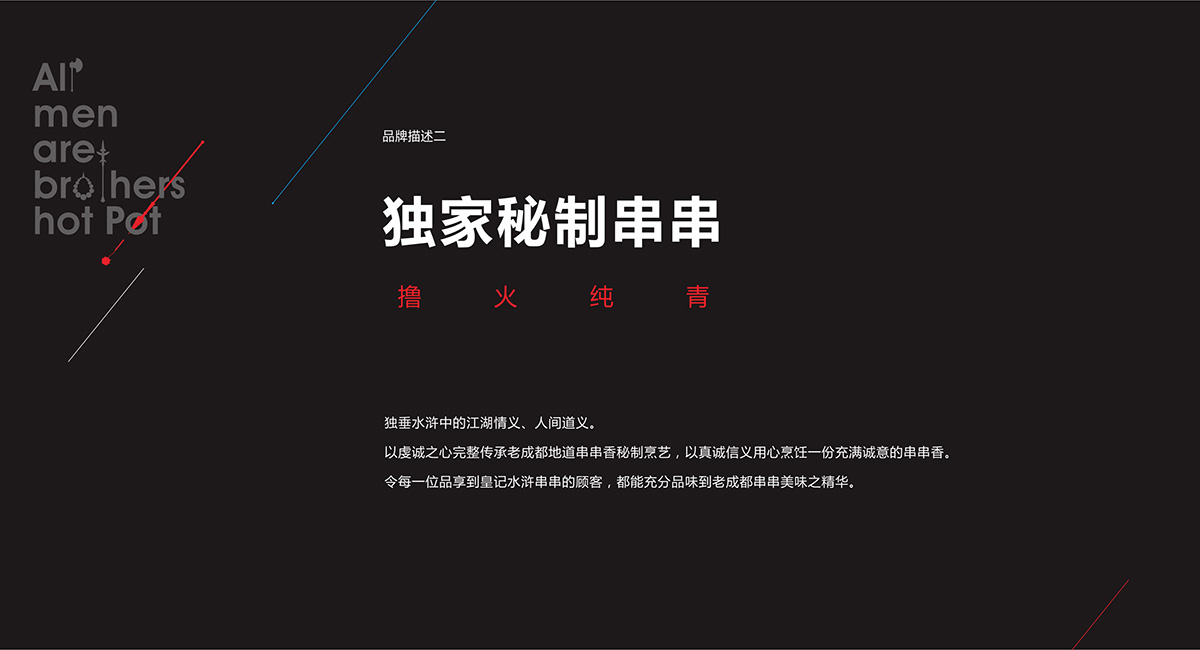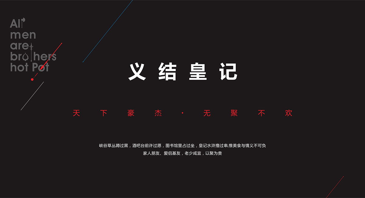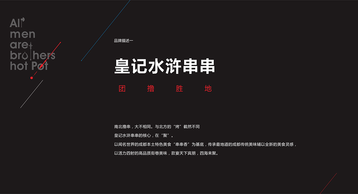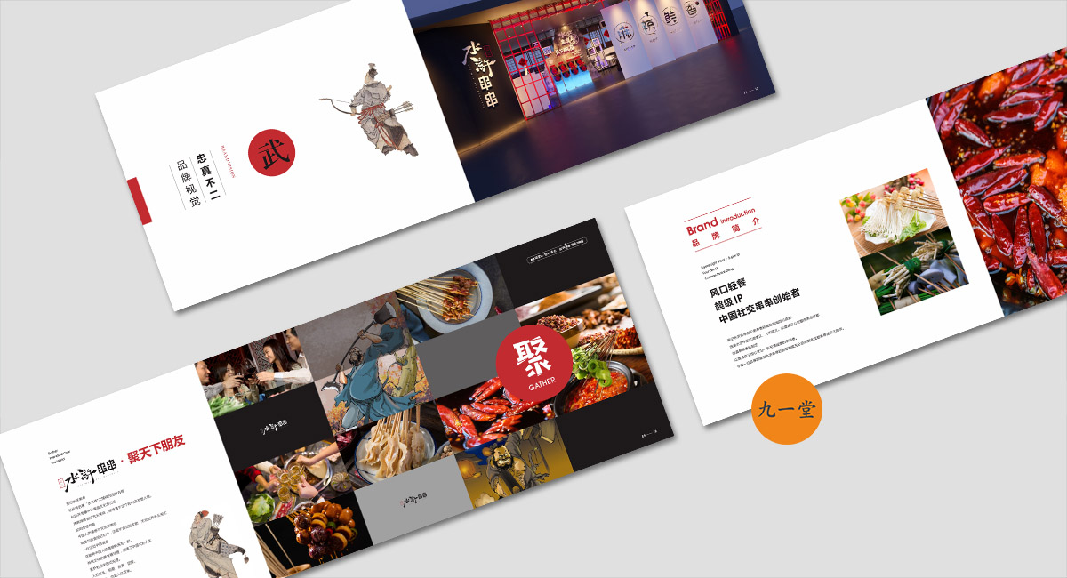 有人的地方就有串串 ,有串串的地方就有江湖, 人就是江湖。南北擼串,大不相同。與北方的“烤”截然不同,皇記水滸串串的核心,在“聚”。以聞名世界的成都本土特色美食“串串香”為基底,傳承最地道的成都傳統(tǒng)美味,輔以全新的美食靈感,以活力四射的高品質(zhì)街巷美味,款宴天下賓朋,四海來聚。由此成都九韻一雅堂品牌策劃設(shè)計(jì)為皇城老院子火鍋梳理出屬于自己的獨(dú)特的品牌核心定位語”常聚久歡”將它的品牌調(diào)性,品牌定位,品牌體驗(yàn)貼心融為一體。