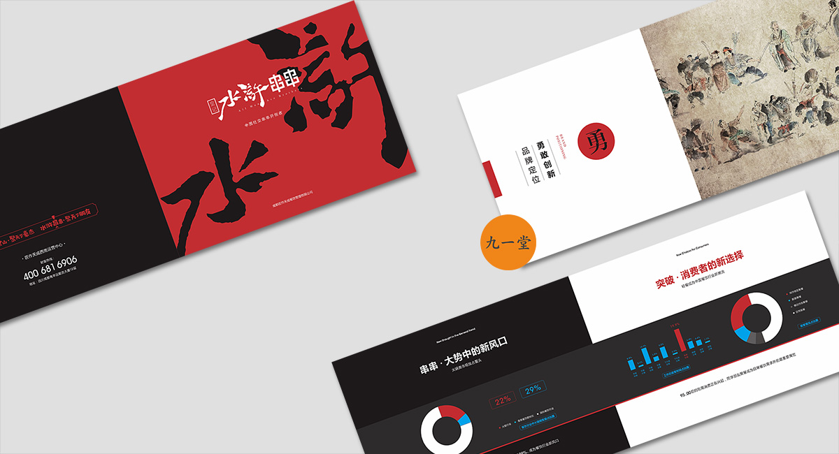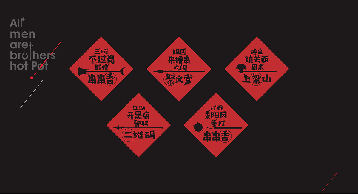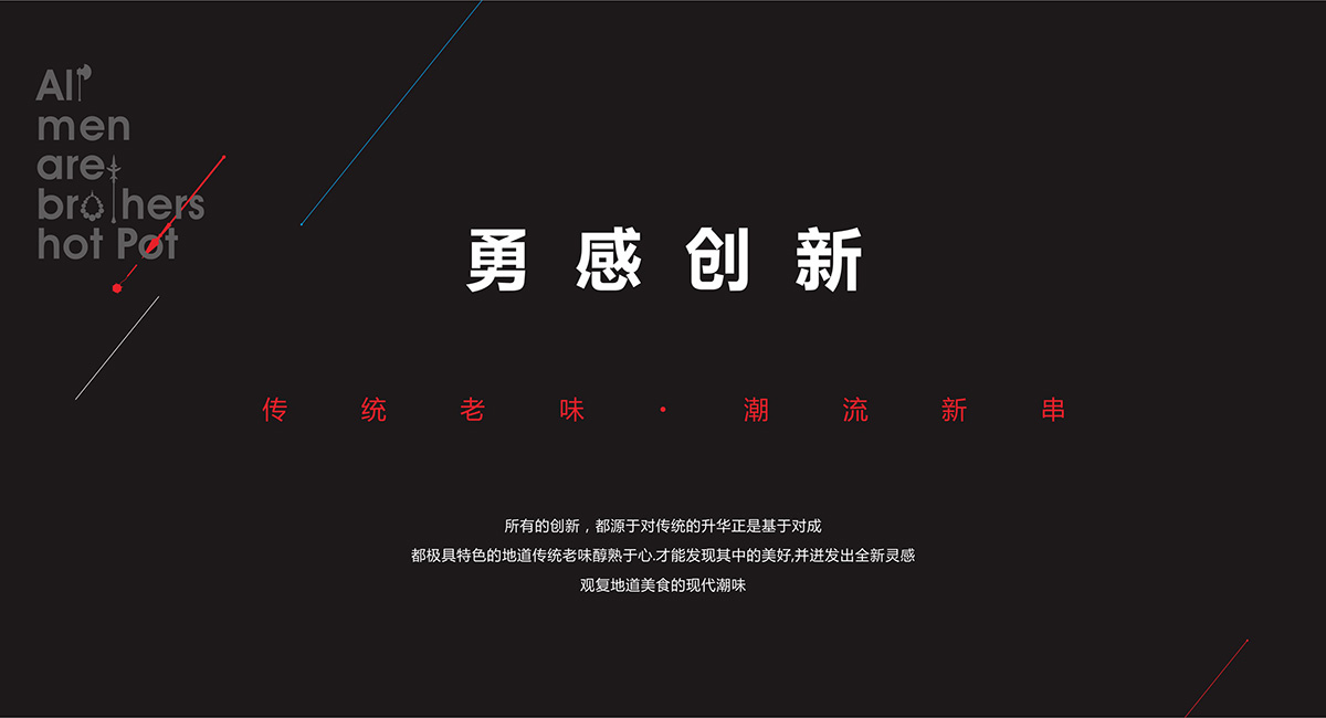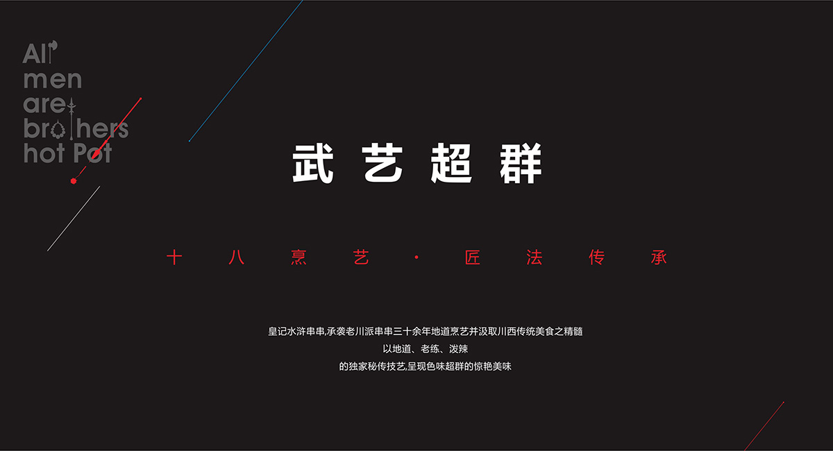 有人的地方就有串串 ,有串串的地方就有江湖, 人就是江湖。南北擼串,大不相同。與北方的“烤”截然不同,皇記水滸串串的核心,在“聚”。以聞名世界的成都本土特色美食“串串香”為基底,傳承最地道的成都傳統(tǒng)美味,輔以全新的美食靈感,以活力四射的高品質(zhì)街巷美味,款宴天下賓朋,四海來聚。由此成都九韻一雅堂品牌策劃設(shè)計(jì)為皇城老院子火鍋梳理出屬于自己的獨(dú)特的品牌核心定位語”常聚久歡”將它的品牌調(diào)性,品牌定位,品牌體驗(yàn)貼心融為一體。