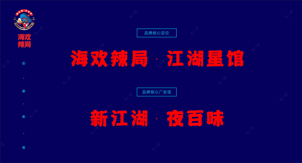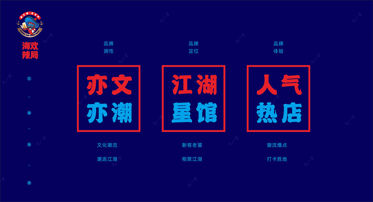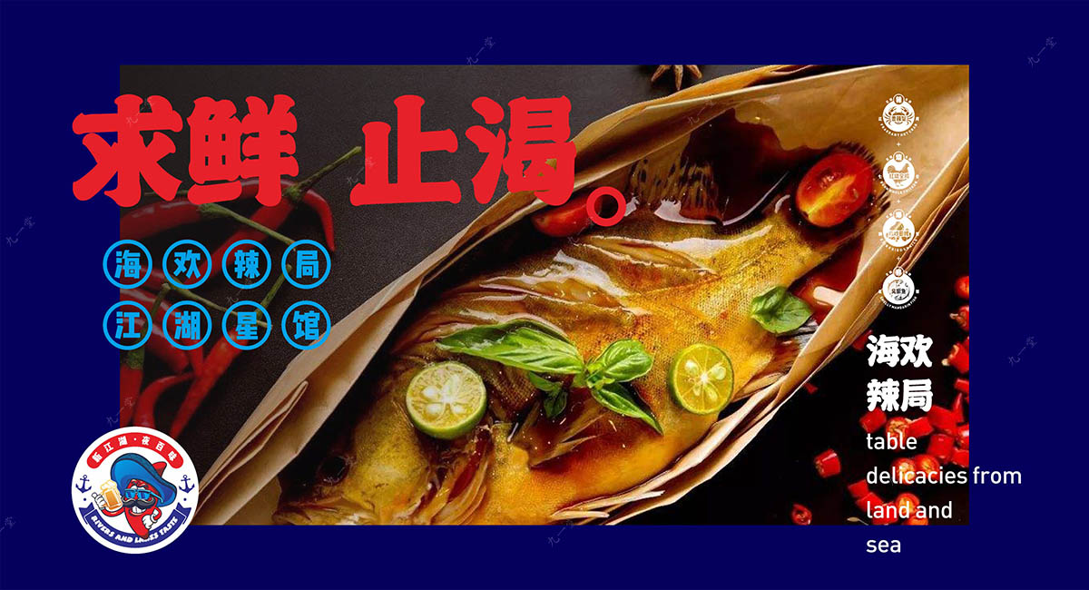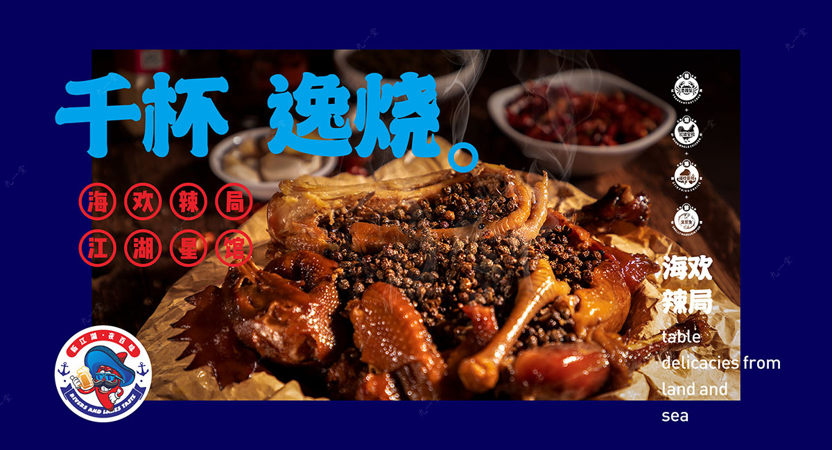 當消費者們吃慣了平常的家常菜之后,也開始追求一些新奇的味道,江湖菜應運而生,江湖菜以其獨特的味道,及人情味的體驗讓消費者感受到美食的另一種魅力。海歡辣局用知你冷暖的走心江湖味,迎遍天下夜歸人、饕餮客 。所謂情,來海歡辣局品皆世道情,有情有義,不虛此行 。所謂味,海歡辣局傳承川派烹藝精髓,以上佳食材,烹制中國各地地道江湖好味。九韻一雅堂品牌策劃此次提出“海歡辣局,江湖星館”這一品牌核心定位,讓文化潮流邂逅江湖 ,新客老饕相聚江湖,讓海歡辣局成為潮流爆點,打卡勝地。以年輕市場更為喜愛的熱辣口感演繹最為地道的口味。