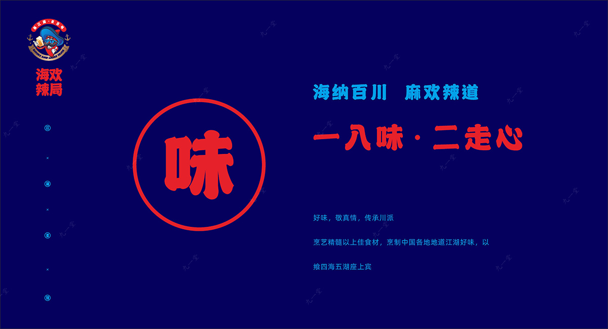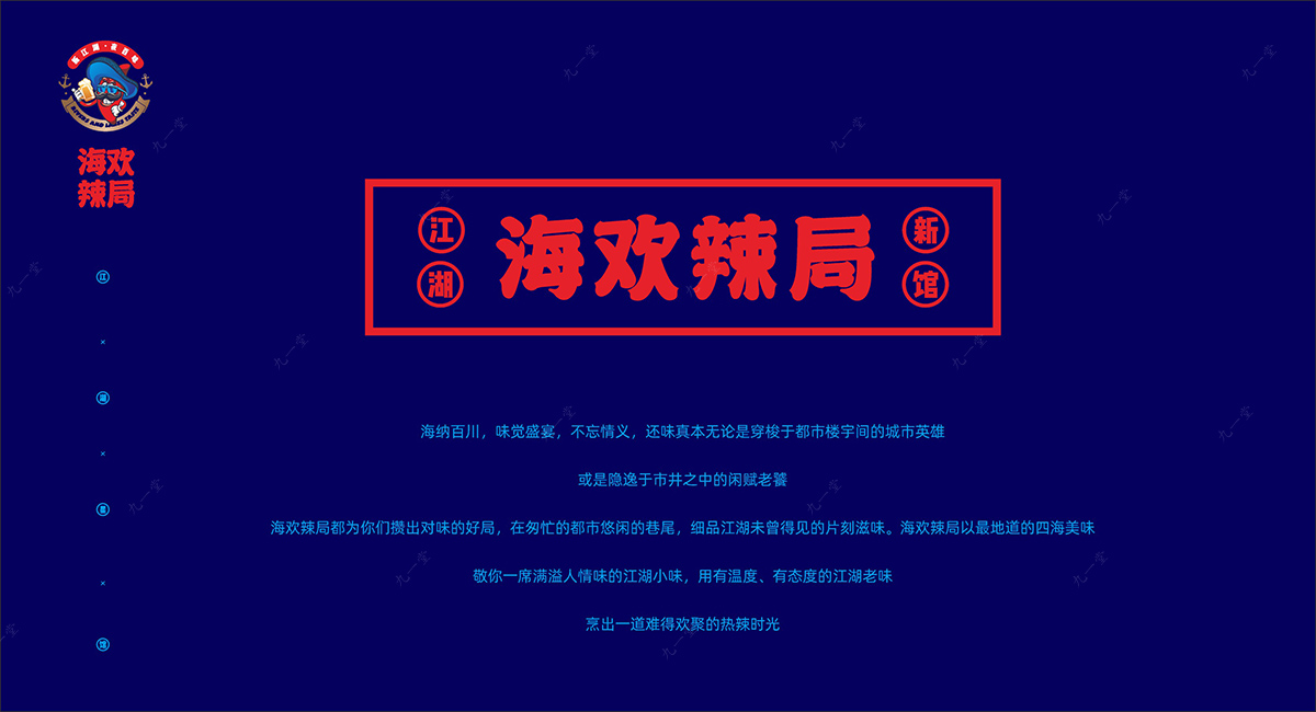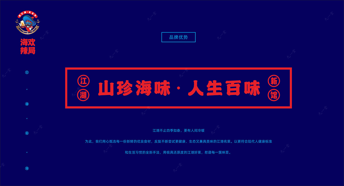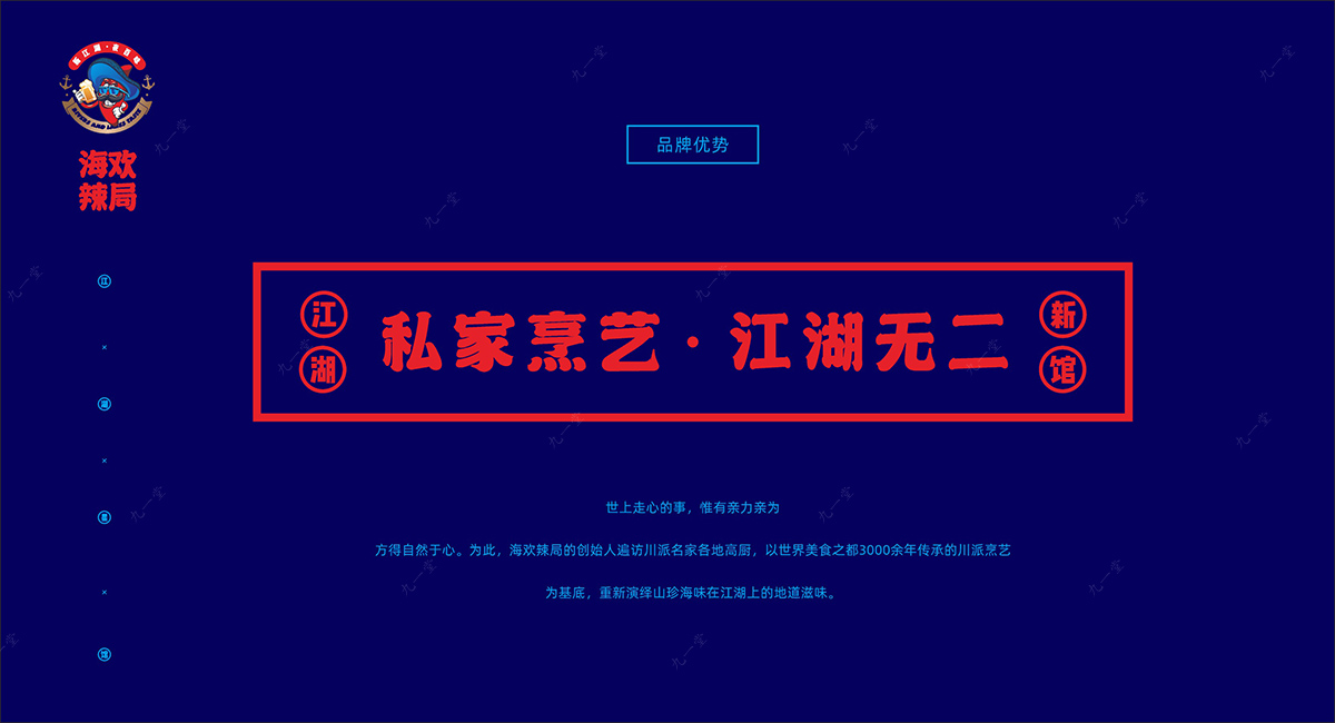 當消費者們吃慣了平常的家常菜之后,也開始追求一些新奇的味道,江湖菜應運而生,江湖菜以其獨特的味道,及人情味的體驗讓消費者感受到美食的另一種魅力。海歡辣局用知你冷暖的走心江湖味,迎遍天下夜歸人、饕餮客 。所謂情,來海歡辣局品皆世道情,有情有義,不虛此行 。所謂味,海歡辣局傳承川派烹藝精髓,以上佳食材,烹制中國各地地道江湖好味。九韻一雅堂品牌策劃此次提出“海歡辣局,江湖星館”這一品牌核心定位,讓文化潮流邂逅江湖 ,新客老饕相聚江湖,讓海歡辣局成為潮流爆點,打卡勝地。以年輕市場更為喜愛的熱辣口感演繹最為地道的口味。