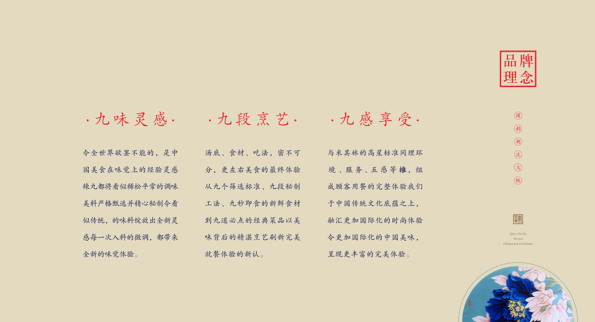 大賞中國風九都承襲中國火鍋文化精粹,并汲取成都匠法之精以地道、波林并揉具創新的獨家秘制烹藝,呈現色味超群的驚艷美味。創新潮流味所有的創新,都源于對傳統的升,華辣九都正是基于對成都極具特色的地道傳統老味醇熟心,才能發現其中的美好,并迸發出全新靈感,觀復地道美食的現代潮味。非凡新體驗辣九都以全新的空間文化體驗,帶來全新的經典品質享受,為大都市的全齡顧客引入全新的美食社交文化,帶來欲罷不能的舌尖盛筵。