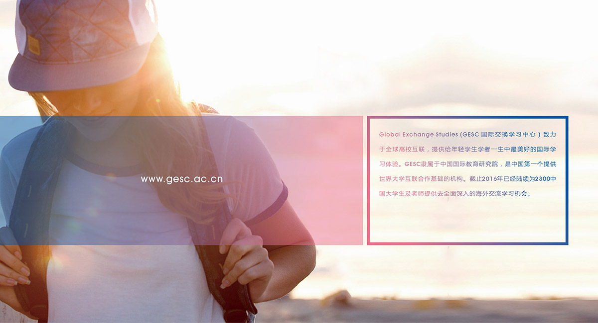 Global Exchange Studies(GESC國際交換學習中心)致力于全球高校互聯,提供給年輕學生學者一生中最美好的國際學習體驗。GESC屬于中國國際育研究院,是中國第一個提供世界大學互聯合作基礎的機構。截止2016年已經陸續為2300中國大學生及老師提供去全面深入的海外交流學習機會。此次九韻一雅堂為GESC提供品牌升級服務,旨在提升品牌品質和重塑品牌形象。為其提煉出三大品牌價值:全球視野 · 助力價值 ,國際洞察 · 實現夢想,多元文化 · 多元分享。