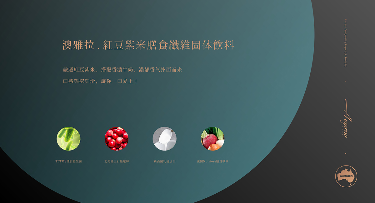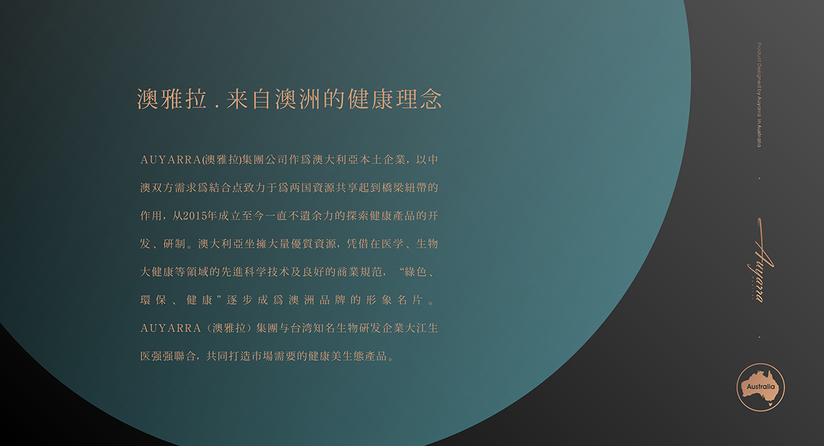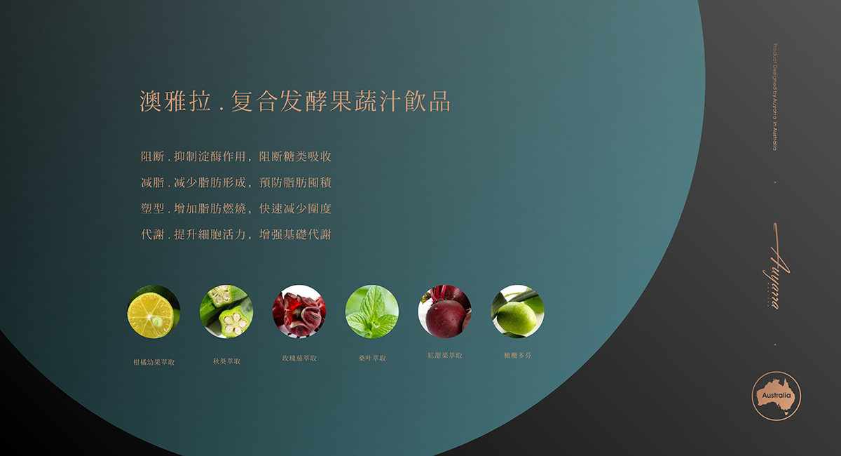 澳雅拉集團是澳大利亞一家本土公司。自2015年成立以來,堅持不懈的探索健康產品。澳雅拉擁有先進的科學技術和醫學領域的良好商業規范,“綠色、環保、健康”已逐漸成為澳大利亞品牌的形象的名片。作為中國和澳大利亞需求的結合產品,澳雅拉致力于兩國之間的資源共享。九韻一雅堂多次與甲方進行設計和交流,提出了整個品牌的定位和調性分析。澳雅拉不僅僅是市場上常見的健康產品的一份子,更是來自澳大利亞優質資源的進口產品,致力于為年輕人提供優質的健康資源。因此,我們在標志的設計上采用手寫體設計,既具有國外時尚感,又具有歷史感和中國傳統書法感,同時賦予其最簡單自然的個性。其次,在包裝的視覺呈現中,我們采取了不同的方法,避免了傳統健康食品包裝的設計理念,整理和提取品牌價值。例如,在復合發酵水果和蔬菜汁飲料中,我們將使用其主要成分“幼橘桔和秋癸”。橙色和秋季結合的想法結合成橙色類似花瓣,顯示美麗的/自然/生態視覺概念和澳大利亞的標志性設計。而“紅豆紫米”我們將其主要成分“紅豆紫米”的創意結合成一個“圓形”圖形,傳遞國際全球化來自澳大利亞和中國本土的、包容的、積極的文化體系得以體現。